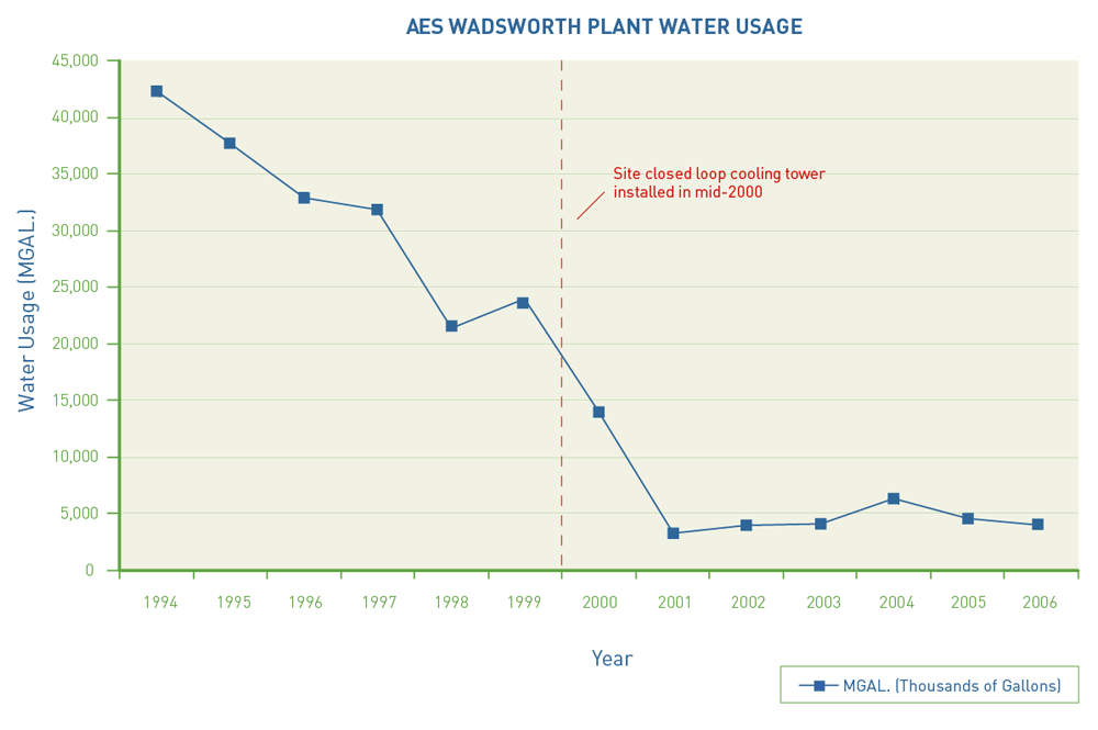 Through focused effort and careful investment, Advanced Elastomer Systems' Wadsworth Plant has achieved a significant reduction in water consumption - from 42 million gallons in 1994 to 4 million gallons in 2006. By comparison, an average Wadsworth household uses more than 82,000 gallons per year. View the AES Water Usage Graph.