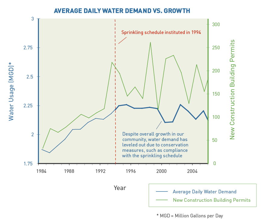 Compliance with the schedule on the part of our residents has been exemplary and had very beneficial effects. Before the schedule was adopted, water demand was growing by about 5 percent per year. Yet even though our community has grown significantly, average daily water demand has increased minimally thanks to conservation measures such as compliance with the sprinkling schedule. View a graph to see the dramatic benefits.